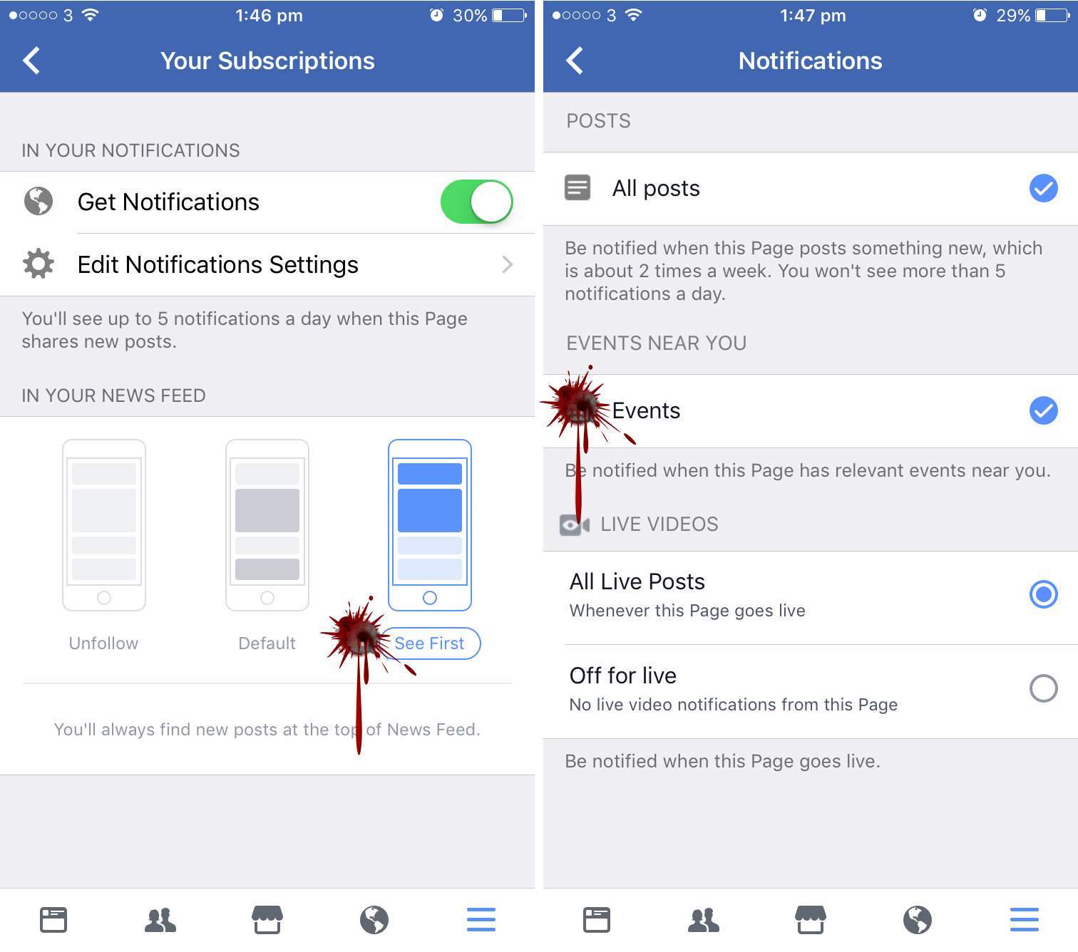 2. On mobile, click on “Following” and you receive three options. If you’d like to see every post from us, click “See First.” To manage your notifications, click on the “Get Notifications” and then click down to “Edit Notification Settings.” There you can select which notifications you’d like to receive on the page, including the all important “Events” notification.